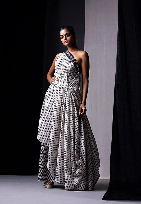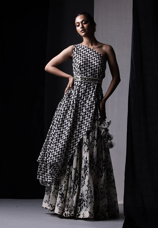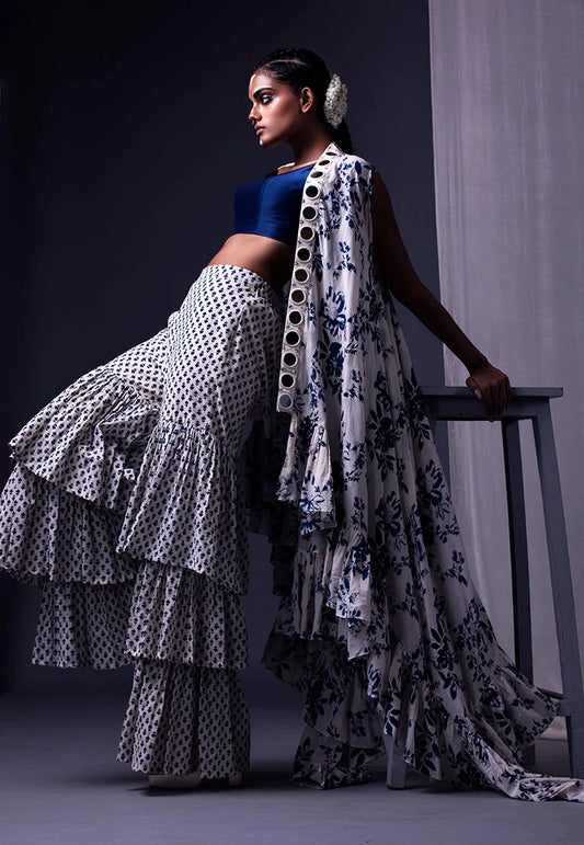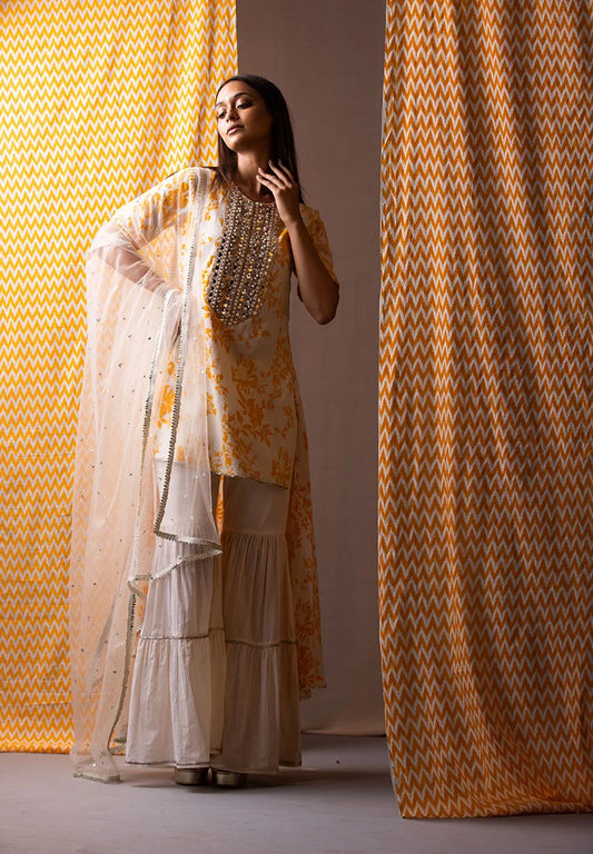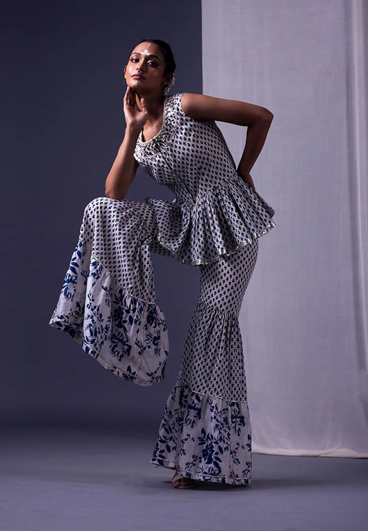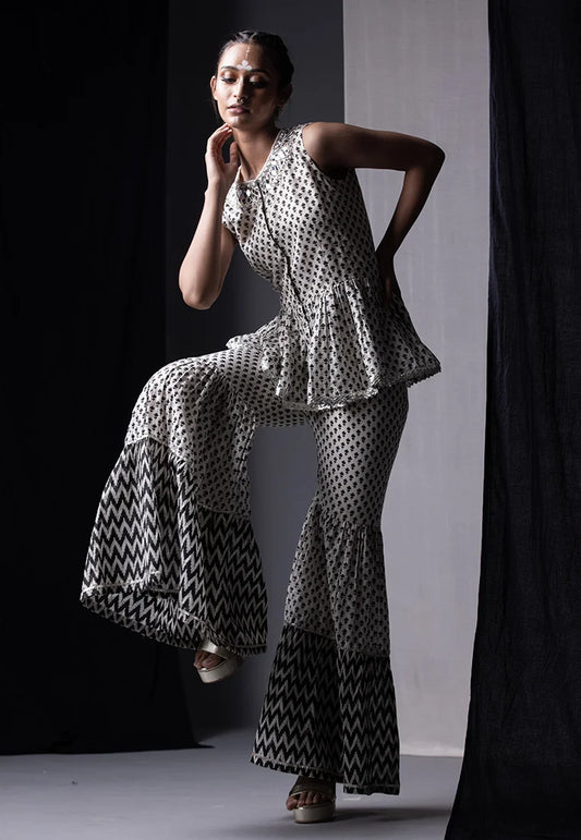 Off White & Black Printed Sharara Set