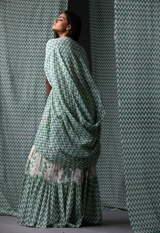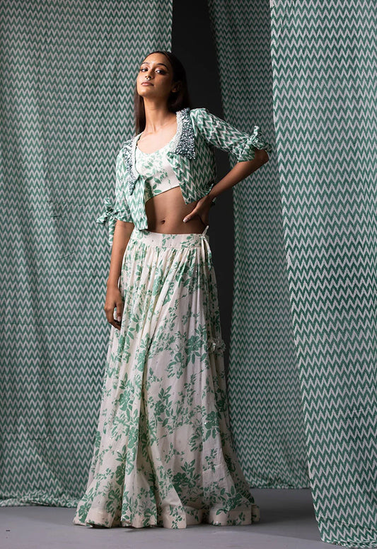 Green & Off White Printed Lehenga Set