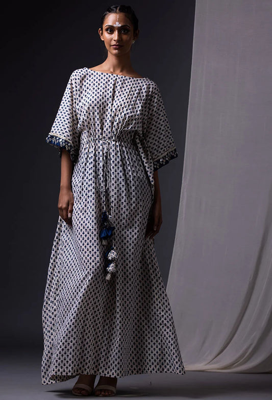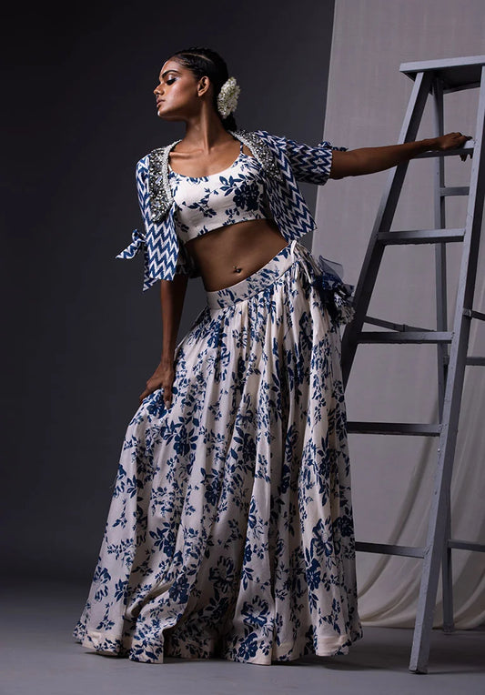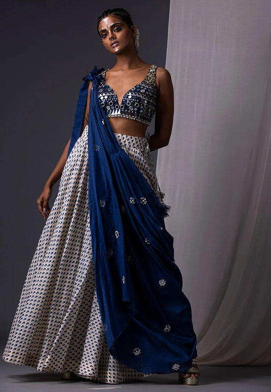 Blue & Off White Printed Lehenga Set