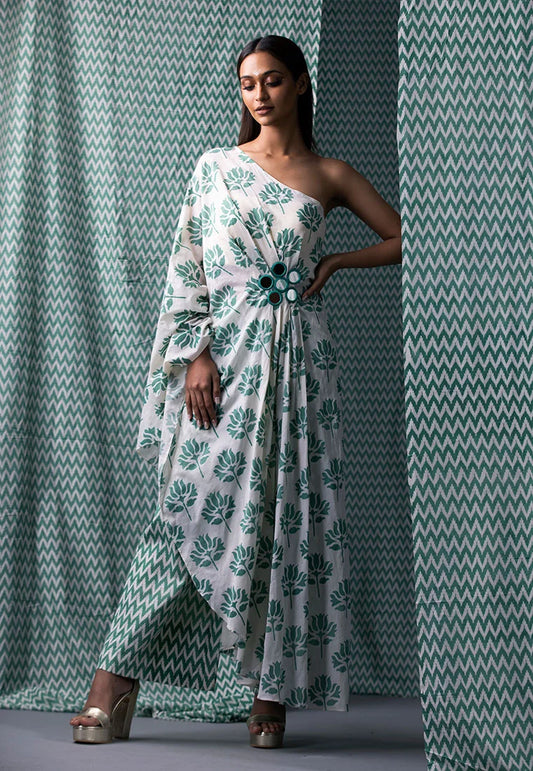 Green Printed One Shoulder Cape Set